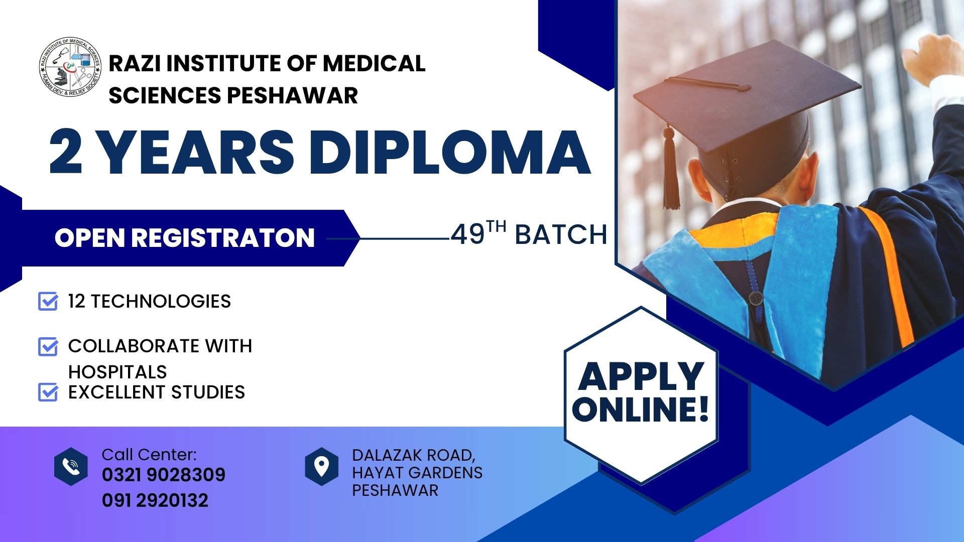 The 49th Batch Diploma Admissions have officially commenced at the Razi Institute of Medical Sciences, Peshawar, offering an excellent opportunity for aspiring students to advance their careers in the field of medical sciences.